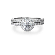 Posh is as posh does, our Posh Solitaire Engagement Ring and Wedding Band Set is a dazzling yet sophisticated declaration of your love. With a halo encircling its centre stone, the Posh Solitaire Ring Set creates a magnificent focal point which is supported by a delicately encrusted band and accompanying eternity ring. When stacked together, this ring set is symbolic of the merging of a couple through marriage.