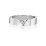 This solitaire style ring features a 0.15 carat round brilliant cut Tru-Diamonds™ gem, in a pressure type setting on a wide band, to beautifully display the centre stone, without having too much sparkle.